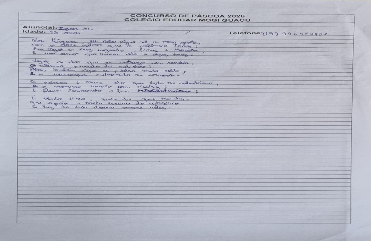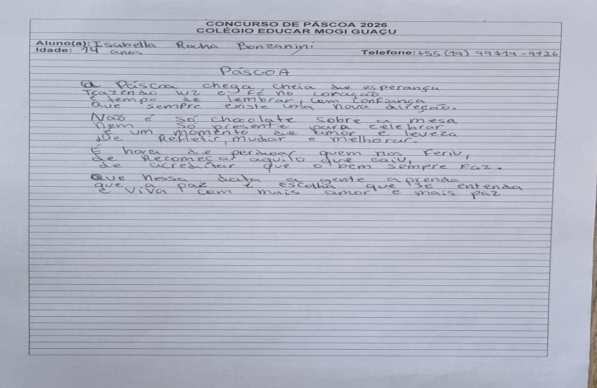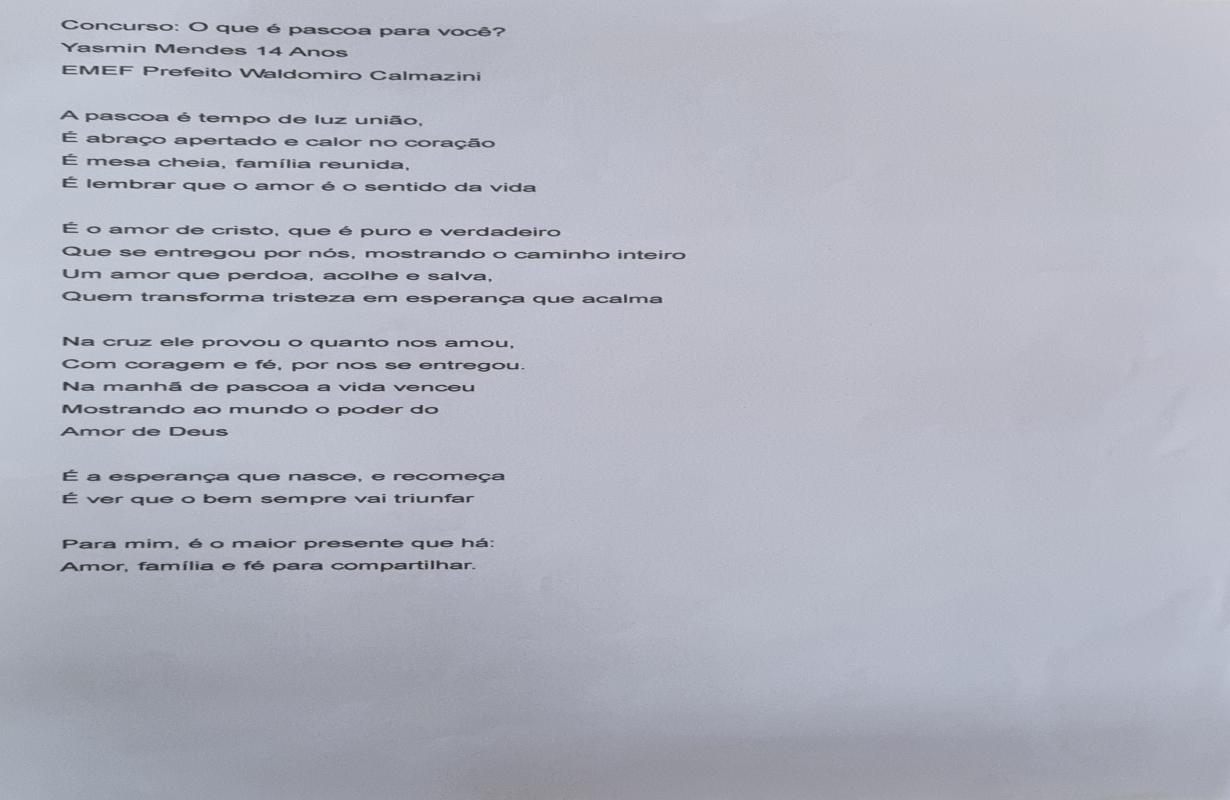 A Associação Comercial parabeniza todos os estudantes participantes e, em especial, os vencedores, que demonstraram criatividade, sensibilidade e reflexão ao abordar o verdadeiro significado da Páscoa. Iniciativas como essa reforçam a importância da educação e incentivam o protagonismo das novas gerações na construção de uma sociedade mais consciente e inspiradora.